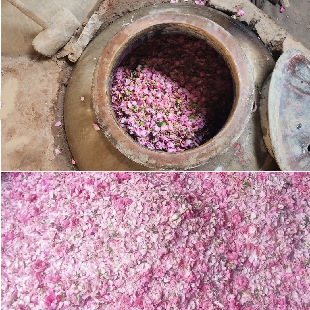 銅のポットに180kgのバラを入れ、炭火の間接熱で